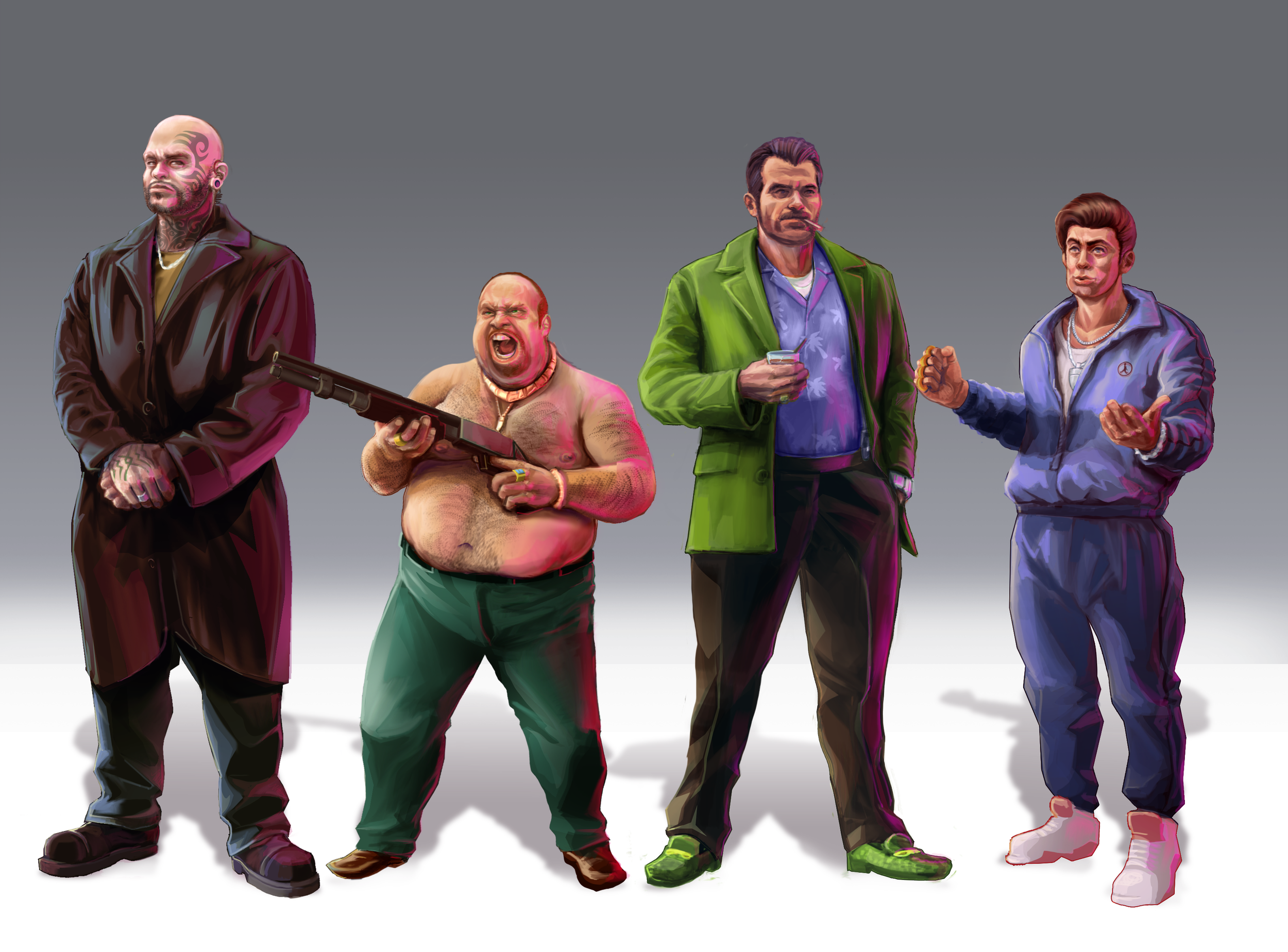 Character design for AA RPG title referencing contemporary mob movie tropes, 2023.