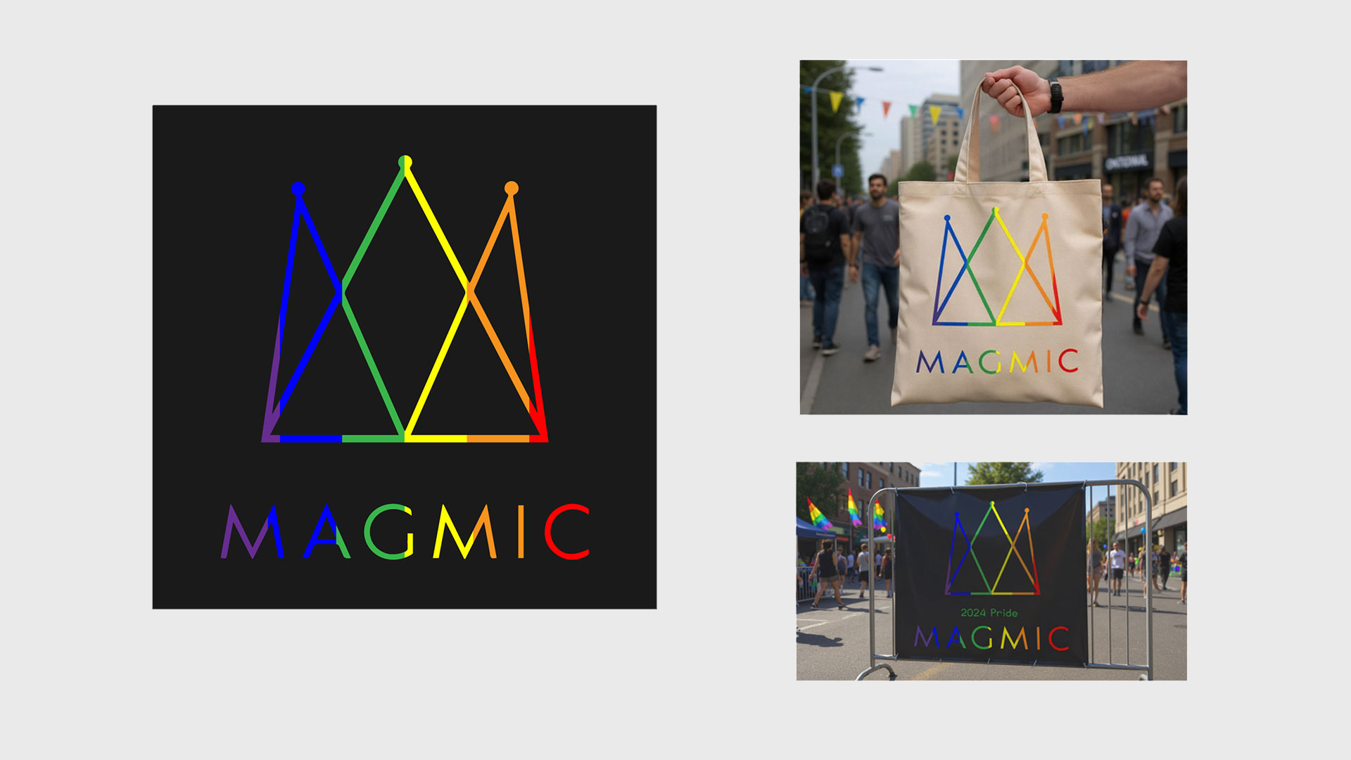Pride design created for Magmic's 2024 Pride month campaign in Ontario: A quick “just make the logo rainbow” brief? Not quite. For Ottawa Pride, I reimagined Magmic’s crown mark as a vibrant festival identity — from digital to the streets. The rainbow geometry carried onto eco-friendly totes (because visibility and sustainability win hearts) and even the barricades right outside Magmic’s office, where thousands passed through. A simple tweak turned into a bold, joyful brand moment rooted in local pride and presence.
