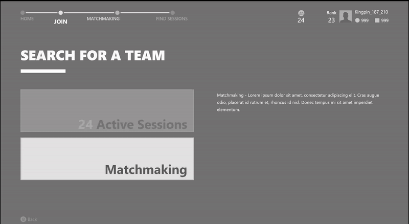 Bkom Studios was contracted by Avalanche to explore how matchmaking and loadout flow could be streamlined for a multiplayer mode. This presented an opportunity to design a player-facing system that balanced narrative immersion (“mercenaries picking up contracts”) with functional gameplay funneling—despite the project's uncertain fate.